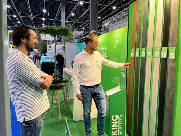 Evert van Tol van King Rootbarrier licht bezoekers voor over de verschillende soorten onkruiddoeken en wortelweringproducten.