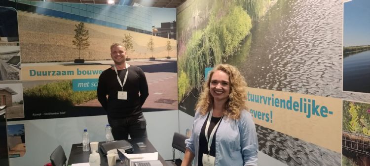 Jasper Nieuwe Boer en Tanja van der Veen van Nautilus Eco-solutions promoten ook dit jaar weer de Aqua Flora. Met die producten bieden ze gemeenten een manier aan om zo snel mogelijk en zo duurzaam mogelijk een natuurvriendelijke oever te creëren. 'Dit doen wij onder andere met onze vegetatiematten ook wel oevermatten genoemd.'