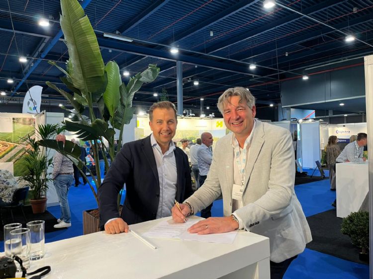 Murat Ercan van Fleets-Online en Rick Middendorp van Krinkels Automatisering namens Elkarij Groep ondertekenen hun nieuwe samenwerking op de beurs. Beide partijen zetten hiermee in op een langdurige samenwerking waarin Fleets-Online data van machines en auto's zal gaan verzamelen van alle bedrijven die onder de Elkarij Groep vallen om zo betere inzichten te verkrijgen in efficiency en duurzaamheid. Ercan: 'Denk bijvoorbeeld aan het bijhouden van de Co2-uitstoot, dat is straks met één druk op de knop inzichtelijk.' Middendorp: 'Doelstelling van ons is om door integratie van de gebruikte werkordersystemen automatische afhandeling van de geplande taken te bereiken. Zo krijgen we volledig inzicht in onze uitvoering.' Flora Nova is het eerste bedrijf onder de Elkarij Groep die wordt voorzien van de oplossingen van Fleets-Online.