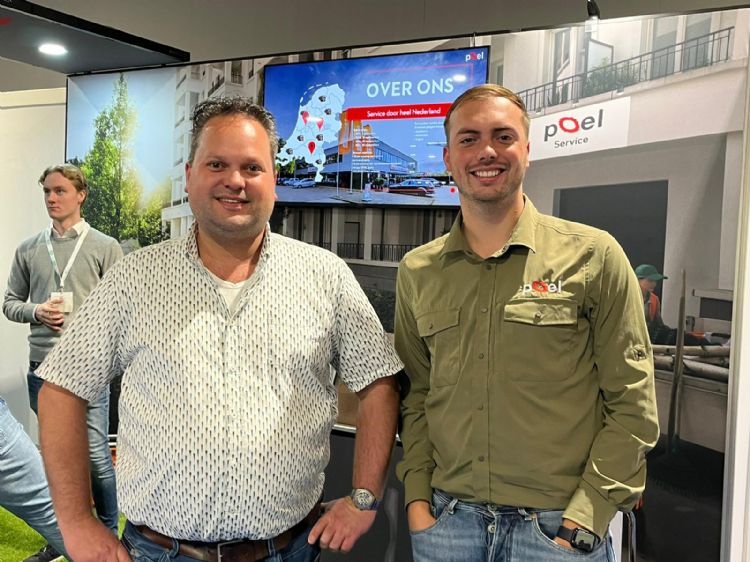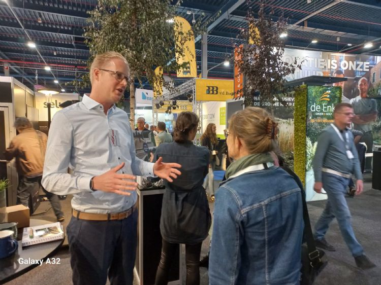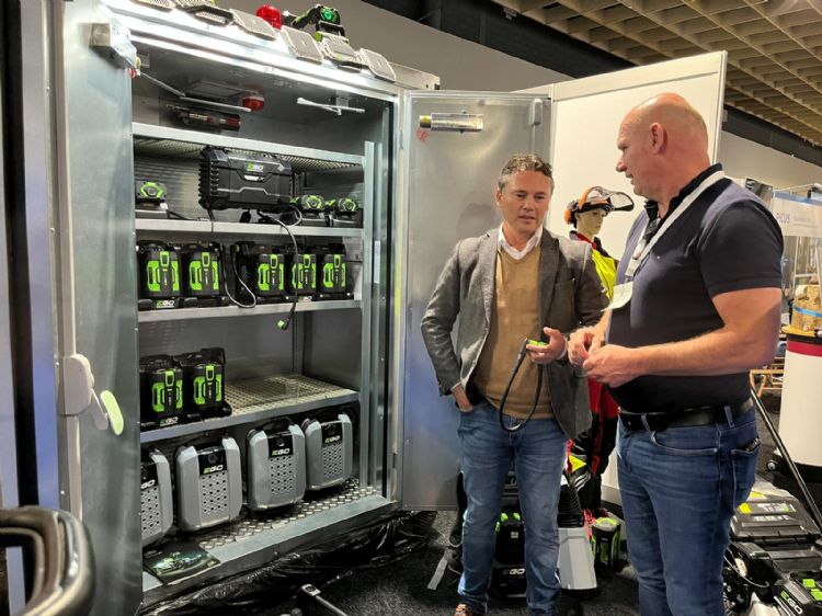 Op de stand van Stierman de Leeuw is Gerko de Graaff van EGO in gesprek met groenvoorziener Harrie Vaessens van Vaessens Groen. De Graaff showt het nieuwste van het nieuwste: het één stekkerprincipe van EGO wat in het voorjaar van 2024 op de markt komt.