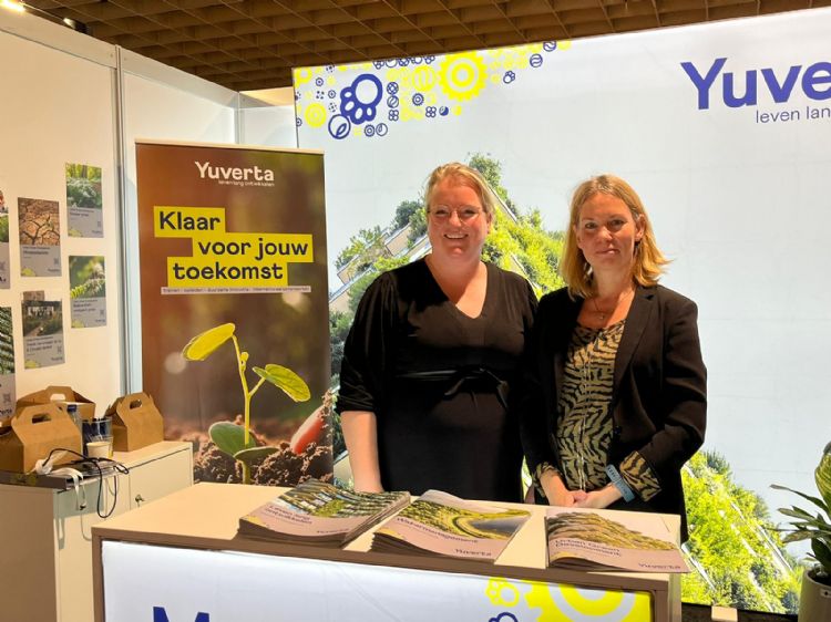 Ilona Berendsen en Sjitske Oudekerke (l) van Yuverta Leven Lang Ontwikkelen staan op de beurs om aandacht te vragen voor onder andere de nieuwe opleiding Urban Green Development.