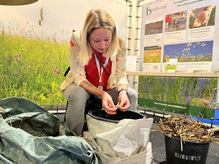 Databeheerder Nina Litjens van de Gemeente Haarlem pelt op de stand van Biodivers zaden van de Gele Lis. Biodivers levert inheems autochtoon zaad, Klaas Hemke van Meekeren van het bedrijf: 'Wij oogsten uit oude bronnen, echt vanuit de natuurgebieden.'