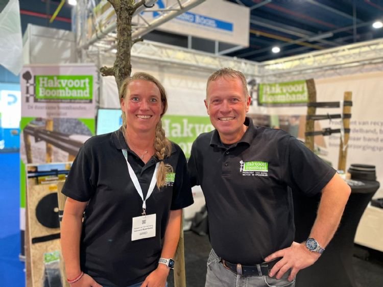 Bij Hakvoort Boomband zien ze dat, hoewel hun bioboomband nu zo'n vijf jaar oud is, deze biologische boomband veelal nog onbekend is binnen gemeenten. Op de foto: Heleen van Cronenberg (l) en Luciën van Leijen.