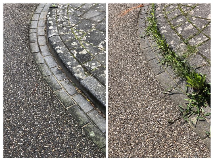 | | Het resultaat op halfverharding vlak voor de behandeling en na 31 dagen. |