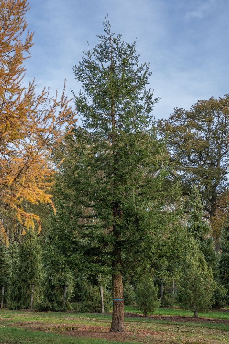 Komt oorspronkelijk uit het Sierra Nevada-gebergte in Californië, in 1853 in Europa geïntroduceerd. Wordt ook wel 'boksboom' genoemd. Zijn vezelige schors kan 30 tot 60 centimeter dik worden, waarmee de boom zich beschermt tegen bosbranden. Sterker nog: voor zijn voortplanting zijn branden zelfs noodzakelijk, want de zaadjes maken in de vruchtbare asgrond de meeste kans om uit te groeien tot jonge bomen.