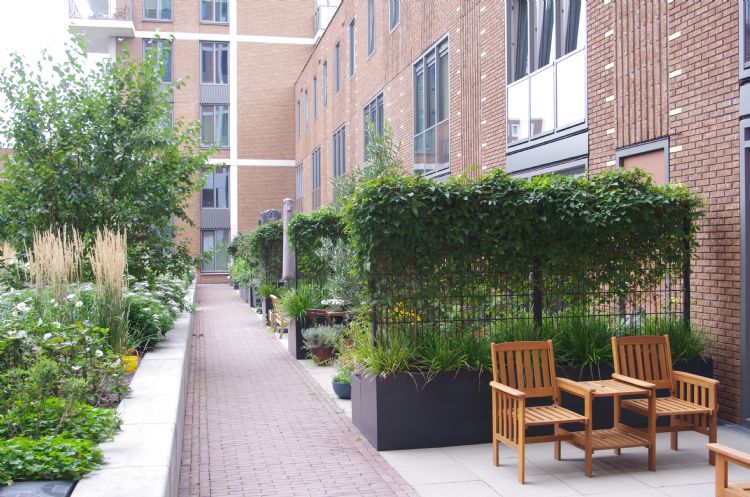De terrassen aan weerszijden worden ook goed gebruikt, valt op. Overal hebben bewoners eigen inrichtingselementen in de ruimte gezet. Dat varieert van speeltoestellen tot aan hangmatten en grote bloempotten. 'Je ziet dat mensen zich de ruimte eigen maken. Dat is prima. Sterker nog, het is een kroon op het werk. Ik zie dat die groene terrasafscheidingen goed werken. Mensen bouwen er op voort. Ze zetten er potten bij, planten, een tuinsetje. Super! Heel goed. Ik zie speelgoed rondslingeren. Er loopt een moeder met een koekje, een huiskat sluipt tussen de planten, er is door kinderen gekrijt op de stenen. Dat is allemaal precies zo bedacht. Laat het lekker gebeuren, zeg ik.'