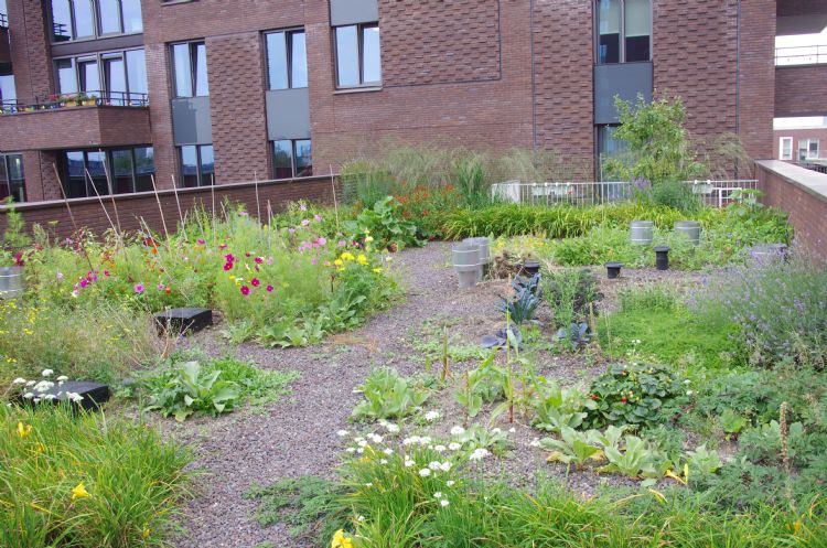 Maar dat is goed uitgepakt; buurtbewoners omarmden het initiatief. Er werd een actieve moestuinclub gevormd rond de daktuin. Tussen de bloemen zijn onder meer tomaten te zien, kool, lavendel en aardbeien. Een vlinderstruik schiet er omhoog en er groeit een flinke rabarber. 'Het is een actieve club, kennelijk. Vorige week kreeg ik een mail van ze. Ze wilden graag weten wie de ontwerper is en vragen hoe ze de bodemcondities kunnen verbeteren om hier beter te kunnen tuinieren. Dat geeft aan dat de bewoners er goed mee bezig zijn.'