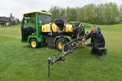 De grote zware John Deere 5070M-tractor en de professionele John Deere-zitcirkelmaaier in de loods bewijzen dat de rayonmedewerkers al ervaring hebben met dit Amerikaans topmerk. Ook bestaan er al langer contacten met dealer Kraakman. Al meer dan tien jaar, schat verkoopadviseur Jan-Hein de Winter. Hij vertelt: 'Kort voor aflevering hebben we de door de gemeente Medemblik gewenste aanpassingen uitgevoerd. Allereerst was dat het aanbrengen van een verstelbare trekbek. De tractor moet namelijk ook een laadwagen trekken die een lage aanspanning heeft. Verder hebben we op de hefinrichting achter (categorie 1, red.) een driepuntsframe gebouwd. Hiermee kun je werktuigen nog gemakkelijker aankoppelen. De voorkant hebben we uitgerust met een fronthefinstallatie met een 540 rpm-aftakas. Ook hebben we een passende set frontgewichten geleverd.'