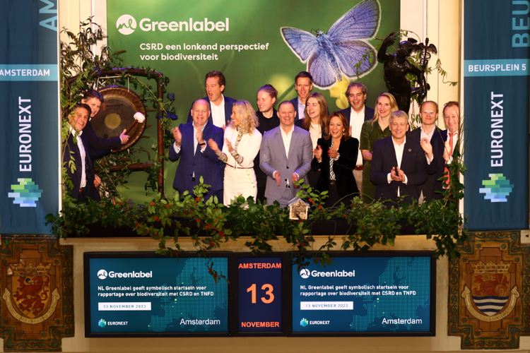 Op 13 november om 9 uur heeft NL Greenlabel op de beursgong geslagen en opende daarmee de Euronext Amsterdam. Hiermee vragen 'de aanjagers van de natuurinclusieve leefomgeving' aandacht voor het belang van de biodiversiteit. Ze geven daarmee symbolisch het startsein voor de manier van rapporteren (Corporate Sustainability Reporting Directive - CSRD en Taskforce on Nature-related Financial Disclosures (TNFD)), waarin duurzaamheid en biodiversiteit de norm wordt.