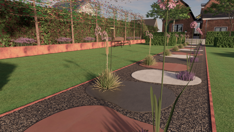 In tuinen tref je steeds vaker organische vormen aan, die een gevoel van beweging en vrijheid toevoegen aan de buitenruimte. Op deze trend speelt Betondingen in met de nieuwe organische tegel met opening, die met 1,20 m bij 1 m een behoorlijk formaat heeft. 'Dus plant je een bloemetje in het gat, dan kun je nog vlot over deze tegel heen lopen', verduidelijkt Dirk Hoogenboom. 'Maar even zo makkelijk plaats je een boom met verlichting in de tegel, waardoor je een fraaie eyecatcher in je tuin hebt. En we kunnen op verzoek de organische tegel ook zonder uitsparing maken.'