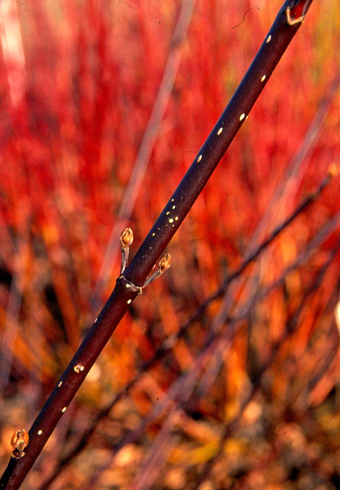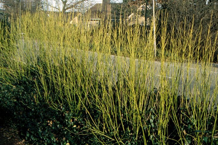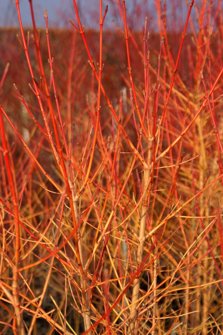 Cornus sericeaDe afgelopen decennia is de naam van deze soort verschillende keren gewisseld van Cornus sercicea naar Cornus stolonifera. Tegenwoordig moeten we weer Cornus sericea zeggen. Ook dit is een nauw aan Cornus alba verwante opgaande struik tot circa 2 meter hoog en 3 meter breed. Opvallend kenmerk van deze van origine uit noordelijk Noord-Amerika afkomstige heester is dat de zijtakken aan de voet vastwortelen. De takken zijn helder- tot donkerrood. De bloemen zijn dof crèmewit en ook de vruchten zijn wit. Er is een behoorlijke variatie in cultivars, zowel in takkleuren als in groeiwijze.De laagblijvende 'Kelseyi' is een oude cultivar (1927), maar heeft vooral sinds de Jaren tachtig een enorme opgang gemaakt als vakbeplanter in de openbare ruimte. De plant wordt uiteindelijk 0,75-1 meter hoog en ongeveer twee keer zo breed. De twijgen zijn 's winters bruingroen met donkerroodbruine toppen. Het is een uiterst bruikbare heester, waarvan de gevoeligheid voor strooizout eigenlijk het enige nadeel is. De geelbladige variant, 'Rosco' (Kelsey's Gold) is veel zwakker en bovendien gevoelig voor zonnebrand. Als deze nog wordt aangeboden, is het zeker niet aan te raden 'Rosco' (Kelsey's Gold) grootschalig toe te passen. Ook 'Sunshine' is gevoelig voor zonnebrand, maar dit is sterk standplaatsafhankelijk. Als de planten op een voldoende vochtige plaats staan, is de kans op zonverbranding beduidend kleiner. Los hiervan is het een mooie, geelbladige struik, met roodbruine wintertwijgen. Zonder twijfel de meest bekende cultivar van Cornus sericea is 'Flaviramea'. Het is een opgaande struik tot zo'n 2 meter hoog met opvallend geelgroene wintertwijgen. 'Flaviramea' is uitstekend te combineren met bijvoorbeeld Cornus alba 'Kesselringii of 'Sibirica'. De Amerikaanse cultivar 'Budd's Yellow' heeft een nuance lichtere twijgen, maar verschilt verder nauwelijks van 'Flaviramea'. 'Silver and Gold' ontstond als mutant in 'Flaviramea'. Afgezien van de witgerande bladeren, crèmekleurig aan jonge scheuten, is de plant identiek aan 'Flaviramea'. Eveneens zilverbont is 'White Gold', waarbij 'White' naar de bladkleuren verwijst en 'Gold' naar de wintertwijgen. Het is een zeer stabiel bonte cultivar die erg mooi is in combinatie met vaste planten of coniferen. 'White Gold' wordt soms aangeboden onder de naam 'White Spot'. Wel duidelijk anders is 'Cardinal'. Deze plant groeit iets slanker omhoog, tot ongeveer 2,5 meter. De wintertwijgen zijn bruinoranje, met intenser oranjerood gekleurde toppen. Een opvallend kenmerk van 'Cardinal' is dat de twijgen iets gedraaid zijn. Dit geeft de plant een sierlijk uiterlijk, wat vooral 's winters opvallend is. Toepassing en teeltDe soorten Cornus alba, Cornus amomum, Cornus sanguinea en Cornus sericea en hun cultivars zijn bij uitstek geschikt om in het openbaar groen toe te passen. De planten zijn relatief goedkoop, stellen over het algemeen weinig eisen en hebben naar verhouding een hoge sierwaarde. Sommige hebben bont blad, andere opvallende vruchten en uiteraard zijn er de gekleurde wintertwijgen. De planten kunnen worden toegepast langs wegen, op brede taluds, in middelgrote tot grote plantvakken etc. Let alleen bij de toepassing van Cornus sericea 'Kelseyi op de gevoeligheid voor strooizout, want 'Kelseyi' kan problemen geven.Om de kleurige takken goed te behouden, zullen de planten minstens eens per drie jaar diep gesnoeid moeten worden. De planten hebben een vrij hoge waarde voor de biodiversiteit. Het zijn dichte struiken, waarin zich 's zomers kleine dieren kunnen verschuilen. De bloei trekt veel insecten aan en de vruchten, die zeker door de natuurlijke soorten, maar ook door verschillende cultivars rijkelijk worden geproduceerd, zijn aantrekkelijk voor vogels. En tenslotte, in het geval van Cornus sanguinea hebben we het ook nog over een inheems gewas. Zo zijn er dus nauwelijks redenen om geen winterkornoelje te gebruiken.