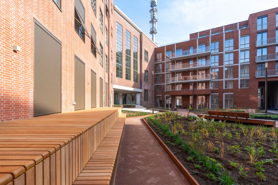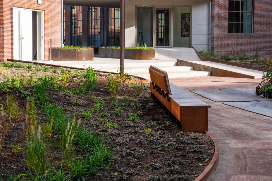 'In de daktuin hebben we op een hoogte van 50 centimeter tot 1 meter achttien verschillende soorten struiken en bomen geplaatst; daarvoor konden we de cortenstalen keerwanden van FURNS goed gebruiken', licht Verberne toe. 'In de keerwanden zijn zitbanden geïntegreerd met rugleuningen. De circa 200 bewoners van Amadeiro delen de daktuin met het bedrijf L-founders of loyalty, dat in de kantoorruimte van de voormalige telefooncentrale is gevestigd.' De medewerkers kunnen er in hun middagpauze buiten zitten en hun lunch eten. 'Amadeiro is één van onze grotere projecten. Jaarlijks krijgen we vaak twee van zulke projecten binnen. Voor dit soort grote opdrachten, maar ook voor kleine werken we graag met FURNS samen. We hebben er al jaren een account en kunnen hierdoor makkelijk bestellen. Wat me aanspreekt bij FURNS? De kwaliteit van de producten. De ontwerpen van FURNS zijn technisch goed doordacht. En dat de mensen die bij dit Udense bedrijf werken graag meedenken bij onze tuinontwerpen, vinden we ook fijn. Soms sturen we een tekening naar FURNS met de vraag of ze ons advies kunnen geven, en dat krijgen we dan ook. FURNS is bereid om mee te denken. We bestellen vooral projecten op maat. Voor wat architecten bedenken, is vaak geen standaard maat beschikbaar. Dat maatwerk duurder is, snapt de opdrachtgever meestal wel. En als de hogere prijs voor maatwerk toch een probleem is, proberen we er in overleg met FURNS uit te komen.'
