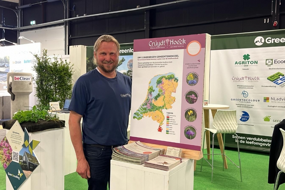 Jasper Helmantel van Cruydt Hoeck staat op de gezamenlijke stand van NL Greenlabel aandacht te vragen voor hun gebiedseigen gemeentemengsel voor biodiversiteitsherstel. 'Wij willen gemeenten op dit gebied compleet ontzorgen. We zien dat gemeenten de wil en het budget bestaat, maar vaak niet de kennis en de tijd. Daar komen wij in beeld.'