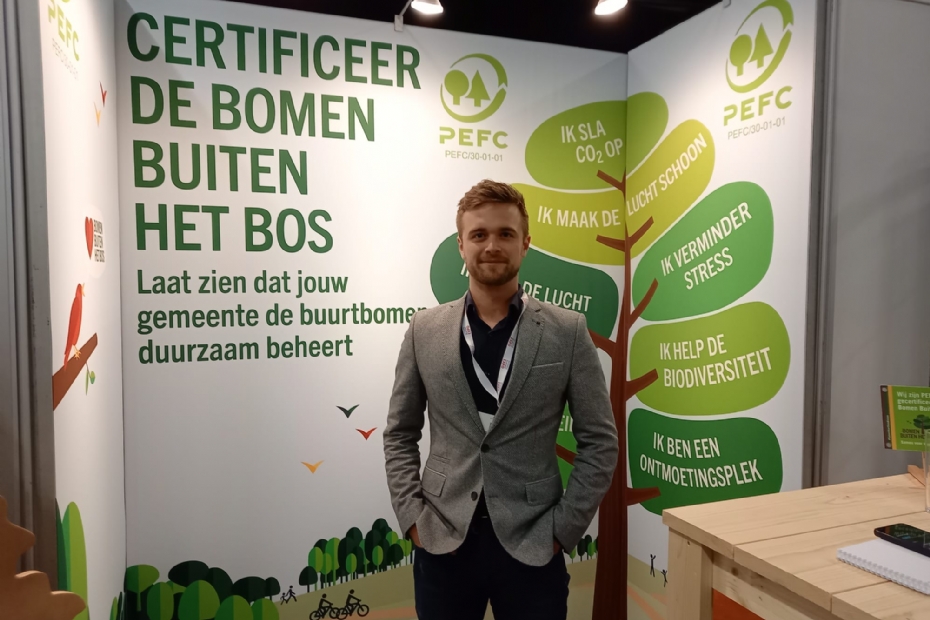 Gemeenten zijn nog een beetje afwachtend, maar wel nieuwsgierig naar het nieuwe PEFC-keurmerk Bomen Buiten het Bos en hoe dat te integreren in hun beleid. Ze zijn vaak verwikkeld in in ingewikkelde contracten met aannemers. Jelle de Bijl hoopt op deze expo meer bekendheid te krijgen.