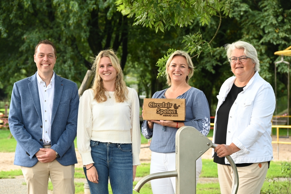 | Uitreiking Circulair Spelen Award 2023 - v.l.n.r. Maarten van Walsum, Sanne Bullens, Liesbeth van Tilburg en Klaar Koenraad |