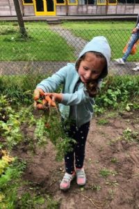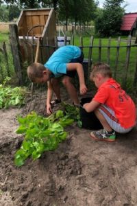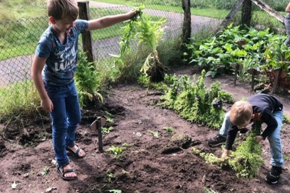 | Jongens enthousiast aan het tuinieren in een door bewoners gerealiseerd volkstuintje |