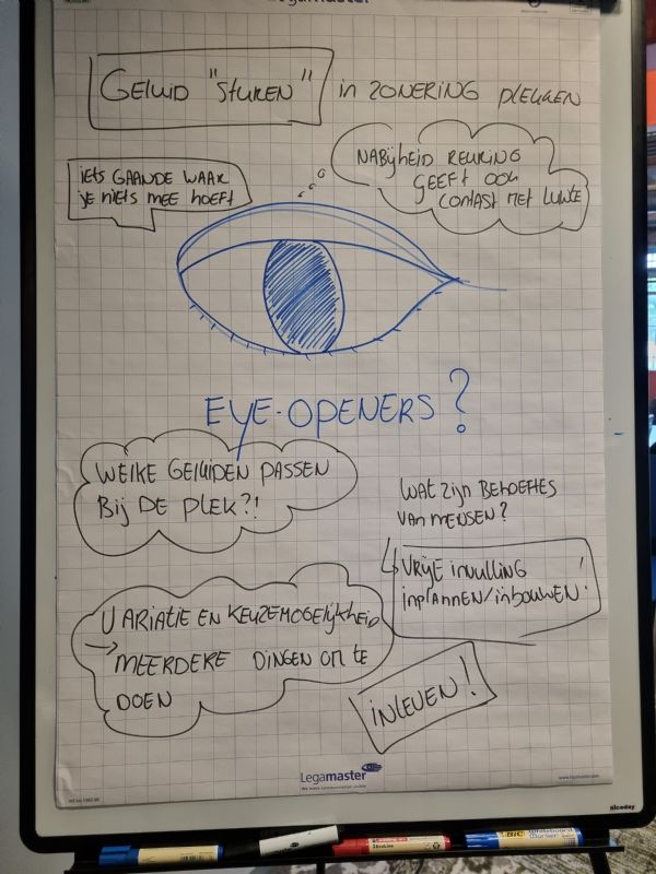 Publieke ruimtes dienen steeds meer als achtertuin in stedelijke gebieden. Overheden zoeken ruimte en willen steeds meer programmeren in de openbare ruimte. Maar veel mensen zoeken ook naar rustpuntjes in de publieke buitenruimte. Kan dat allemaal wel samen? Deze interactieve sessie gaat over verschillende perspectieven van rustbeleving door mensen. En over het samen leggen van de ingewikkelde puzzel om spelen, sport en luwte samen te laten komen. Martine Sluijs, verbonden aan Pip & Partners, waarbij PIP staat voor People Inspire People, liet de deelnemers, samen met architect Bart Cardinaal, hun ideale rust-ruimte tekenen. Een eye-opener: rust is niet altijd stilte. Geluiden die bij een omgeving passen, zijn niet (ver)storend.