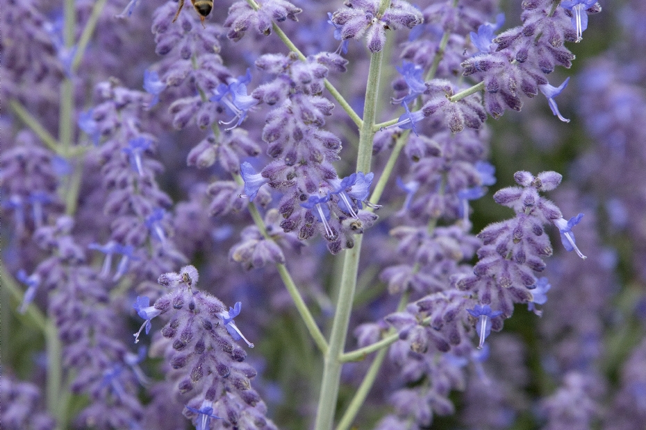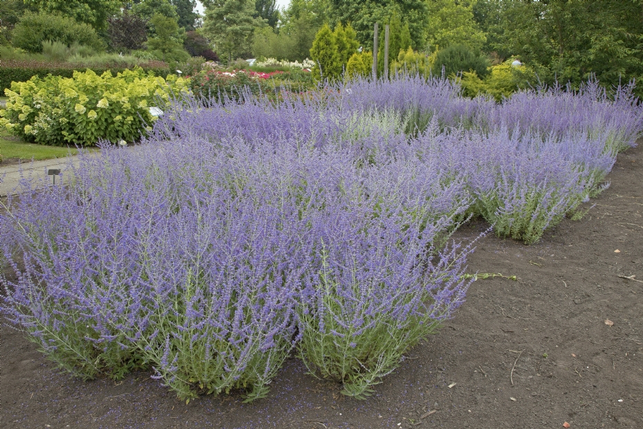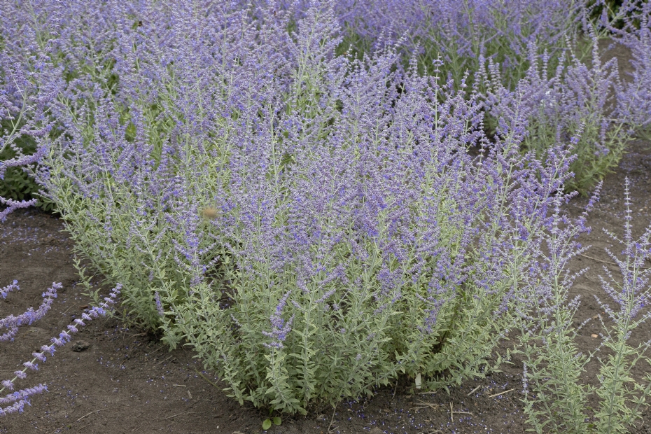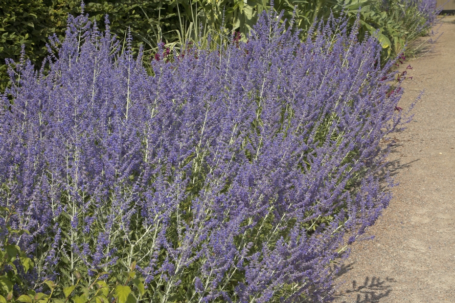 Sier- en gebruikswaarde en toepassingPerovskia is populair en wordt vrij breed toegepast. De planten hebben een voorkeur voor vrij droge grond. Het beste groeit Perovskia in zandige, lemige of zelfs rotsachtige grond. Op veen- en kleigronden is goede drainage van groot belang. Met name in nattere herfst- en wintermaanden, vooral tijdens kwakkelwinters, kunnen de planten het zwaar te verduren hebben. Het zijn niet de lage temperaturen waar Perovskia gevoelig voor is, maar de te grote hoeveelheden vocht rond de wortels.Alle Perovskia zijn uitgesproken warmte- en zonminners. Als ze in de schaduw staan, zullen ze ijl groeien en minder rijk bloeien. Op een goede locatie bloeien ze rijk en langdurig. Bij de meeste cultivars vormen de grijzige bladkleuren een mooie achtergrond voor de bloei. De afzonderlijke bloemen zijn met een grootte van circa 1 cm vrij onopvallend, maar door de massa en het formaat van de bloeiwijzen steelt de bloei toch steeds de show. Pas Perovskia bij voorkeur in groepen toe. De fijne structuur van de planten wordt dan versterkt en de planten hebben steun van elkaar, waardoor ze minder snel openvallen. Door de zachte en complementerende kleuren van blad en bloei kunnen gemakkelijk combinaties met andere planten worden gemaakt. Bloemen met harde, sprekende kleuren en bloemen met pasteltinten combineren goed met Perovskia, evenals witbloeiende en grijsbladige planten. En ook niet onbelangrijk: de bloemen produceren veel nectar, maar niet veel pollen. Ze worden zeer goed door bijen en hommels bevlogen. Dankzij de late bloeitijd leveren ze dus veel voedsel voor bijen in de nazomer.