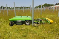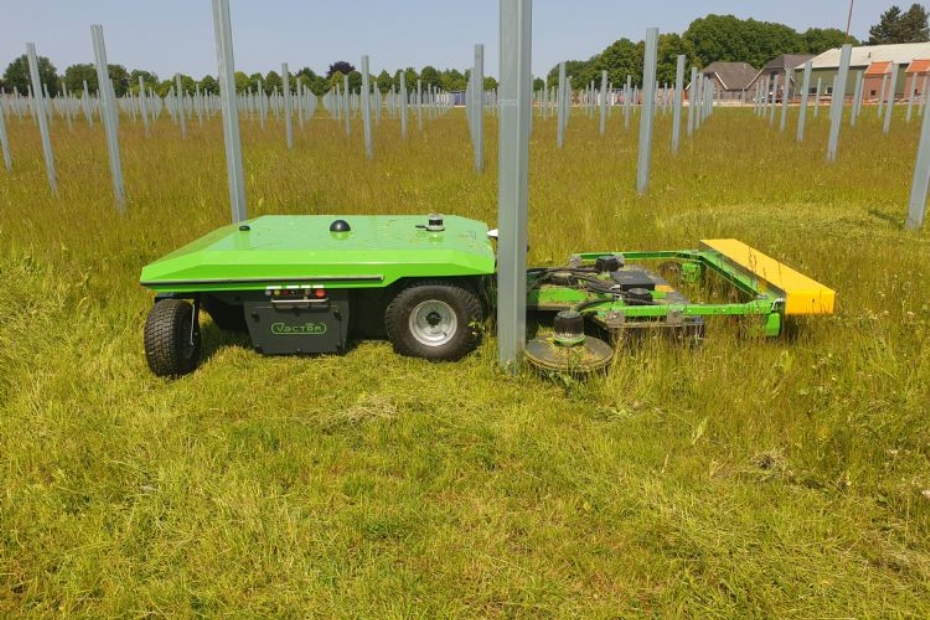 Vector Machines BV - Autonome werktuigdrager (stand 2.25)Deze werktuigdrager is uitgerust met sensoren en mapping technologie die onder zonnepanelen kan maaien als er geen GPS-verbinding is. Door deze autonome werktuigdrager van Vector Machines in te zetten voor het maaien bij zonneparken blijven de zonnepanelen vrij van obstakels. Eerder dit jaar sleepte deze werktuigdrager de innovatieprijs op De Groene Sector Vakbeurs binnen.
