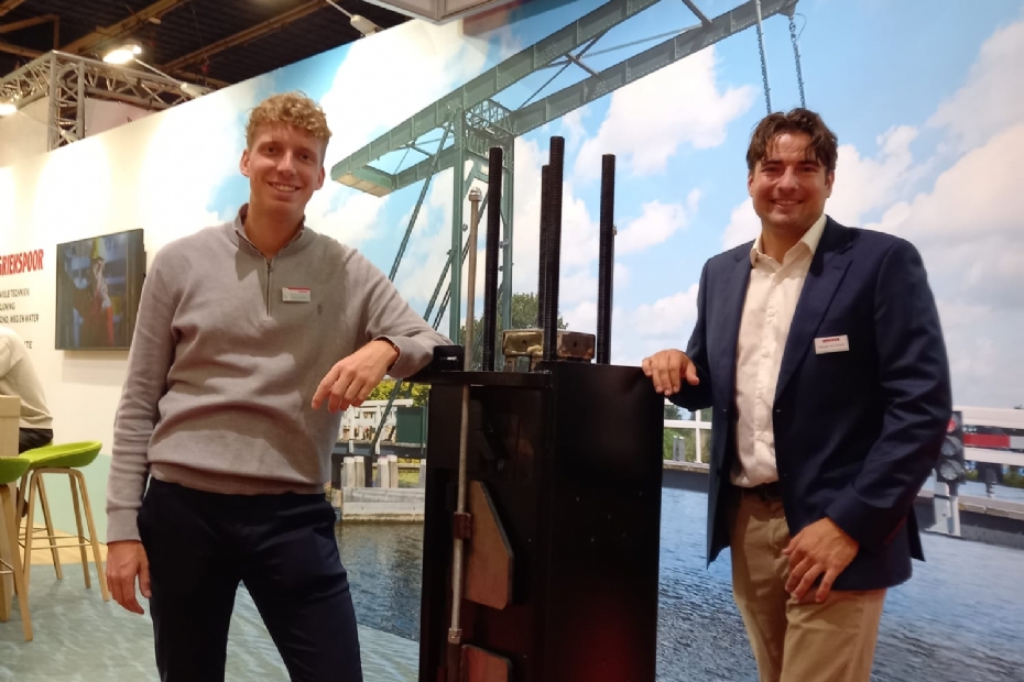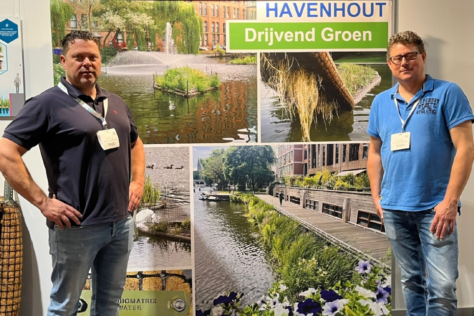 Steden vergroenen kun je ook vanaf het water. Bij Havenhout zijn ze vanuit een specialisatie van drijvende steigers langzaamaan in het gemeentelijk (water)groen gerold. Eigenaren Ate Flens en Willem Kan (l): 'Wij hebben jarenlange kennis over goede duurzame constructies en inmiddels ook voldoende groenprojecten gedaan om deze beurs voor het eerst te bezoeken.'