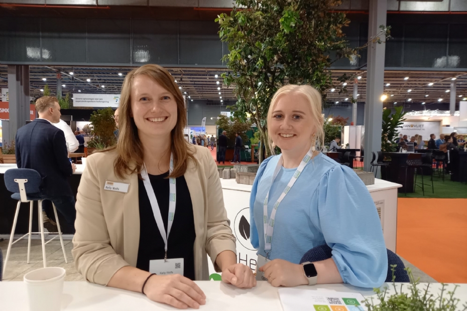 Nieuw op de beurs is Blom Ecologie. Het bedrijf zelf is al ruim 10 jaar oud maar Vakbeurs Openbare Ruimte is de eerste beurs voor het ecologische adviesbureau. Stephan Gielen (l) en Kelly Rebergen willen hier vooral in contact komen met overheden.