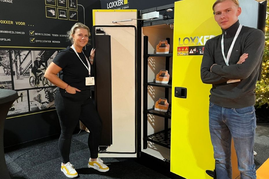 Nieuwe speler op het gebied van accukluizen: Loxxer Nederland. Slechts drie maanden oud staat het bedrijf van Elise en Max van Turenhout op de beurs. De Loxxer kluis is gecertificeerd volgens Kiwa K21045 Brandbeveiligingssystemen. 'Hiermee blijft de brand gegarandeerd 90 minuten in de kast, dit is wat de meeste verzekeringen ook eisen en vragen,' aldus van Turenhout. 'Met bluspoeder wordt de brand in de accukluis geblust en kunnen eventueel andere accu's ook nog worden gered.'