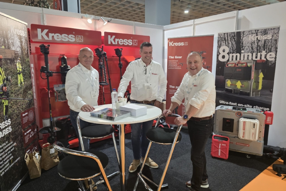 Kress staat voor het eerst op de vakbeurs, ter promotie van het merk aan de gemeente, hoveniers en professionele groenvoorzieners. Alleen maar accu techniek. V.l.n.r. Auke van Minnen, Jitze Skids en Marc Marijnissen.