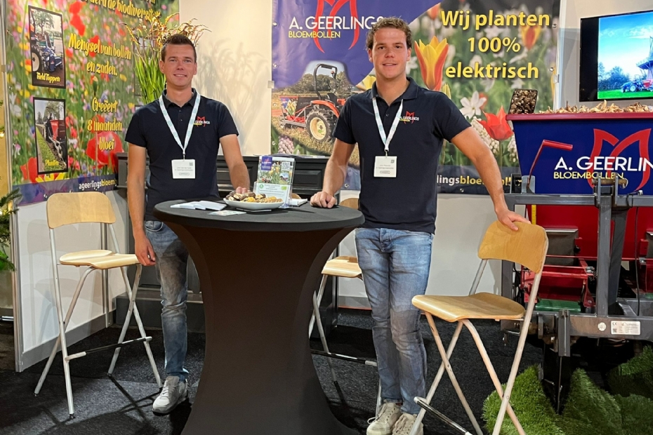 Het jonge bedrijf A. Geerlings kwamen wij vorige week al tegen op GroenTechniek Holland ook hier zijn ze weer van de partij. John van der Hulst (l) met een verleden als loonwerker en Jens Reeuwijk in de kweek en verkoop van bloembollen besloten ze om de handen in één te slaan en een totaal concept te presenteren op het gebied van bollen in de openbare ruimte. Uitzoeken van mengsels, aanplant en evaluatie na één jaar.