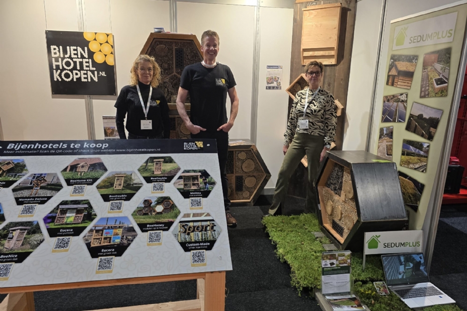 Maury van Haren, Leon Gerrits van Bijenhotel Kopen en Marjo van Sedum Plus, hebben de op de vakbeurs de handen ineen geslagen. Sedum Plus gaat nu over kokos naar vlas en hennep als ondergrond en doet mee aan tegelwipactie. De bijenhotels in combinatie met sedum is een perfecte combinatie. Makkelijk te plaatsen en ideale voedingsbodem.