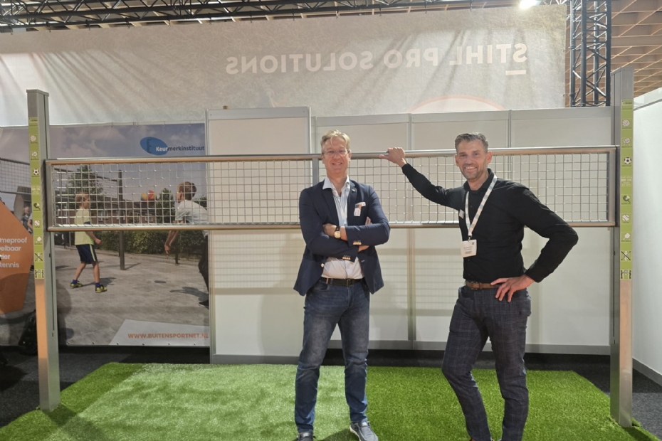 Dennis Veth en Wim Boerendans van Buitensportnet met een multi functioneel buitensport-net. Hufterproof, weerbestendig én meerdere sporten mee te beoefenen door het net in hoogte te verstellen.