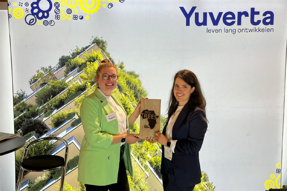 Bij Yuverta Leven Lang Ontwikkelen kreeg Manouk Brouwer (l) uit handen van hoofdredacteur Willemijn van Iersel de Newtrees bokaal uitgereikt. Hieruit blijkt dat de groene opleider Africa Wood Grow steunt een sociale stichting die ontbossing en verwoestijning tegengaat in Kenia.