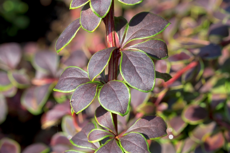 BerberisNet als bij Acer, zijn ook bij Berberis verschillende, zeer bekende donkerbladige cultivars. Deze zijn met name te vinden in Berberis thunbergii, waar 'Atropurpurea' en 'Atropurpurea Nana' veelvuldig worden toegepast. Maar er zijn ook enkele andere donkerbladige cultivars die het vermelden waard zijn. Allereerst Berberis media 'Red Jewel'. Deze ontstond als een mutant uit de groenbladige 'Parkjuweel', wat een hybride is tussen de wintergroene Berberis candidula en de bladverliezende Berberis thunbergii. 'Red Jewel' is een dichtvertakte struik die ongeveer 1 meter hoog wordt. De bladeren zijn glanzend groenrood.Een andere donkerbladige Berberis is Berberis ottawensis 'Superba'. Ook deze plant is een hybride, en wel van Berberis thunbergii en Berberis vulgaris. Het is een forse plant, die zo'n 2 meter hoog wordt, met donkere twijgen en vrij grote, iets grijsblauw berijpte, wijnrode bladeren. 'Superba' kan een best imposante struik worden, maar is helaas gevoelig voor meeldauw. Ook de cultivars van Berberis thunbergii zijn in meer of mindere mate gevoelig voor meeldauw, maar in de praktijk levert dit nauwelijks problemen op, behalve dat de planten er soms wat minder sierlijk uitzien. Er is sinds circa 2000 volop veredeld om Berberis thunbergii-cultivars als visueel aantrekkelijke (pot)planten op de markt te brengen. Maar de planten zijn uiteraard ook geschikt voor toepassing in tuinen. Naast de diverse bladkleuren, zoals witbont met roze groeischeuten, geel en oranje, zijn er cultivars met bruinrood en (steen)rood blad, al dan niet met groengele randjes. De volgende lijst is niet compleet, maar geeft een aardig beeld van de variatie in donkerbladige Berberis thunbergii. Omdat er al voldoende egaal donkerbladige cultivars zijn, worden de bontbladige hier niet genoemd. Allereerst de opgaand groeiende cultivars: 'Atropurpurea' (breed opgaand, dof roodbruin tot purperbruin blad), 'Coronita' en 'Golden Ring' (beide breed spreidend-opgaand, donker purperbruin blad met een smalle lichtgroene rand), 'Helmond Pillar' (eerst zuilvormig, later iets uitzakkend, bladeren donker purperrood), 'Orange Rocket' (breed zuilvormig, jonge bladeren donkeroranje, volwassen bladeren donker steenrood) en 'Red Torch' (zuilvormig, donker purperrood blad). Vervolgens zijn er (min of meer) bolvormig groeiende cultivars: 'Admiration' (afgeplat bolvormig, jonge scheuten oranjerood, volwassen blad steenrood met een smalle, lichtgroene rand), 'Bagatelle' (zeer compact en iets langzamer groeiend, bladeren steenrood), 'Concorde' (compact bolvormig, donker bruinpurper loof). En ten slotte de meer spreidend groeiende: 'Atropurpurea Nana' (eerst bolvormig, later duidelijk meer spreidend, maar meestal als lage haag gesnoeid, bladeren roodbruin tot purperbruin), 'Dart's Red Lady' (laag en breed, met sierlijk gebogen twijgen, blad vrij rond, donkerrood tot zwartrood blad), 'Somerset' (laag en breed, iets grillig met sierlijk gebogen twijgen, bladeren donker roodpurper. Vrijwel alle donkerbladige Berberis thunbergii geven prachtige gele, oranje tot diep oranjerode herfstkleuren.