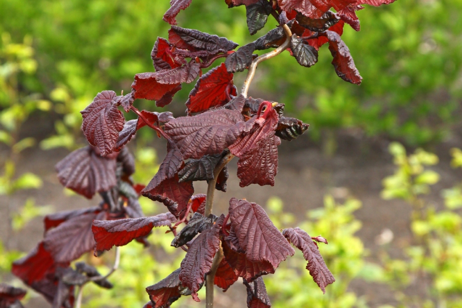 Zoals al in de inleiding geschreven, worden de bomen in dit artikel buiten beschouwing gehouden. Dat geldt dus ook voor de donkerbladige, boomvormige Corylus, zoals onder andere 'Melchior' en 'Te-Terra Red'. De bekendste donkerbladige hazelaar is natuurlijk Corylus maxima 'Purpurea'. Deze forse struik is vooral in het voorjaar mooi, met de diep purperrode bladeren. Later in de zomer kleuren de bladeren veel groener; soms is de paarse tint vrijwel geheel verdwenen. Iets betere bladkleuren vinden we bij het vruchtras Corylus 'Rode Zellernoot'. De bladeren zijn in het voorjaar minder intens van kleur en roder, maar later in de zomer blijft de bladkleur beter zichtbaar. Bovendien zijn de hazelnoten smakelijker en vallen ze gemakkelijker uit de vruchthulzen. Een mooie, iets compactere en meer opgaand groeiende struik is Corylus avellana 'Anny's Purple Dream'. Ook hiervan zijn de bladeren diep roodpurper. Van de bekende kronkelhazelaar, Corylus avellana 'Contorta', zijn er verschillende donkerbladige vormen. Hiervan is 'Red Majestic' de meest gekweekte. De plant heeft dezelfde kronkelige twijgen als 'Contorta', maar de bladeren, die eveneens gekruld zijn, zijn donker purperrood. 'Red Baron' (iets minder sterk gekrulde takken en bladeren) en 'Red Snake' zijn soortgelijke cultivars. Cotinus Soms wat ondergeschoven, maar toch een belangrijk geslacht als het om donkerbladige heesters gaat. De oudste donkerbladige cultivar is Cotinus coggygria 'Purpureus'. Deze is al lange tijd overtroffen door 'Royal Purple'. De bladeren van 'Royal Purple' zijn donkerder roodpurper tot dieppurper. Maar er zijn in de loop der jaren diverse donkerbladige zaailingen op de markt gekomen en onder de namen 'Purpureus' en 'Royal Purple' verkocht. Dit zijn dus geen soortechte planten, maar daarom vaak niet minder mooi. De planten zijn nu eenmaal op de markt, dus behoren deze als Rubrifolius Group benaamd te worden. Wat dan helaas weer niet gebeurt... Andere donkerbladige cultivars van Cotinus coggygria, die op meer bescheiden schaal worden gekweekt, zijn 'Firstpur' (RED SPIRIT), 'Nordine' en 'Red Beauty'. Wel verdient 'Lilla' een aparte vermelding. Deze Hongaarse cultivar groeit duidelijk compacter dan 'Royal Purple'. Wel is het blad iets minder intens van kleur. Dan is er ook nog een aantal donkerbladige hybriden met rood blad. 'Londus' (DUSKY MAIDEN) ontstond uit een kruising tussen Cotinus coggygria 'Velvet Cloak' met de obscure soort Cotinus szechuanensis. Het resultaat is een breed opgaande struik met donker wijnrode bladeren met iets gegolfde bladranden. De herfstkleuren zijn oranje en oranjerood. De prachtige Cotinus 'Grace' is een hybride tussen tussen Cotinus coggygria en Cotinus obovatus. Het is een fors groeiende plant met iets lichter purperrood blad dan de cultivars van Cotinus coggygria. Plant 'Grace' op een plaats waar de (ochtend)zon door de jonge bladeren kan schijnen; het is een van de mooiste effecten die je met donkerbladige heesters kunt bereiken! Ook de herfstkleuren van 'Grace' zijn spectaculair geel, oranje en diep oranjerood. Dit is de invloed van Cotinus obovatus in deze hybride.