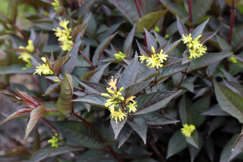 DiervillaEen geslacht dat de laatste jaren steeds populairder wordt is Diervilla. In de openbare ruimte werden deze planten al veel toegepast, maar door de introductie van cultivars met anders gekleurde bladeren steeg de populariteit als tuinplant ook. Diervilla splendens 'El Madrigal' (DIVA) was de eerste cultivar met donker roodbruin blad. Het is een brede struik die, naast de donkere bladeren, ook mooi geel bloeit. Samen met het donkere blad geeft dit een sprankelend effect. Bijkomend voordeel is ook dat Diervilla een zeer goede bijenplant is.Nieuwe cultivars, met nog donkerdere, bijna zwartpurperen bladeren, zijn 'Bokomadade' (DARK DELIGHT/MAGICAL DARK DELIGHT) en 'Bokomastani' (MAGICAL STARRY NIGHT). Beide groeien iets meer opgaand dan DIVA en hebben smaller blad. Bij MAGICAL STARRY NIGHT zijn de bladeren het donkerst, bijna zwart. Ze hebben een wat fluwelige weerschijn en de bladranden zijn duidelijk gegolfd. Net als alle Diervilla bloeien ze geel en trekken ze veel bijen aan.