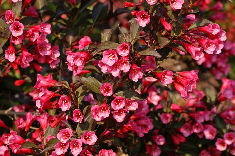 WeigelaAls laatste geslacht waarin donkerbladige cultivars te vinden zijn, mag Weigela natuurlijk niet ontbreken. De oude Weigela florida 'Foliis Purpureis' moeten we snel vergeten. De bladeren worden in de loop van het seizoen meer donkergroen dan bruinpurper en als plant is het een wat warrige, losse groeier. De verbetering, Weigela florida 'Victoria', wordt nog regelmatig toegepast. Ook deze heeft een wat losse groeiwijze, maar de bladeren blijven wat beter op kleur in de loop van de zomer, hoewel ze ook duidelijk groener kleuren. Maar 'Victoria' bloeit ook rijker, met licht paarsroze bloemen.De twee echte verbeteringen van 'Foliis Purpureis' zijn Weigela 'Bokrashine' (NAOMI CAMPBELL/SHINING FANTASY) en Weigela florida 'Alexandra' (WINE & ROSES). Beide hebben een duidelijk dichtere groeiwijze, waarbij NAOMI CAMPBELL/SHINING FANTASY het meest regelmatig groeit. Ook hebben beide cultivars donker purperbruin blad, dat in het voorjaar iets groener is, maar later in de zomer en de rest van het seizoen donker is. Een verschil is dat de bladeren van WINE & ROSES aan de onderkant iets groener zijn dan bij NAOMI CAMPBELL/SHINING FANTASY. Anderzijds bloeit WINE & ROSES iets rijker, met donker rozerode bloemen. Weigela florida 'Verweig 3' (MINOR BLACK) heeft eveneens zeer donker blad, maar groeit breder en lager dan de andere cultivars. De bloemen zijn paarsrood. Ook is er donkerbladige Weigela met witte bloemen. In naam lijkt Weigela 'Courtacad 1' (BLACK AND WHITE) het aantrekkelijkst, maar het is juist Weigela 'Velda' (EBONY AND IVORY) waarvan de bladeren donkerder zijn en de bloemen witter. Beide zijn vrij laag en compact groeiende planten die niet hoger dan ongeveer 1 meter worden. Niet genoemdZoals al geschreven, is deze opsomming niet compleet. Zo ontbreken onder andere cultivars van Hydrangea en Loropetalum. Maar net zoals in een beplantingsplan, moesten er ook in dit artikel keuzes worden gemaakt. Feit is dat donkerbladige heesters een belangrijke groep vormen, onmisbaar in beplantingen en tuinontwerpen. Dat geldt trouwens ook voor geel- en grijsbladige heesters en bonte planten.