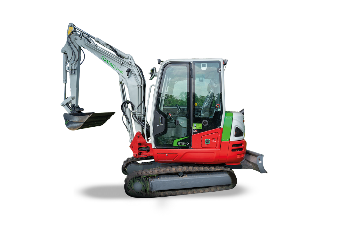 In de serieproductie hebben de opgebouwde elektromotor en de accu een plaats gekregen onder de motorkap. Het bleef echter niet bij een 2-tons en een 2,5-tons Tomach-graafmachine. Na het type ET219 op basis van de Takeuchi TB216 en het type ET225 op basis van een Takeuchi TB225 kwam er vraag naar een 4-tons uitvoering. Ruim een jaar geleden zag de ET240 op basis van een Takeuchi TB235-2 het daglicht. Deze 4-tons uitvoering kreeg een verlengde achterkant om die enorme accu van 70 kWh te kunnen herbergen. 'En daarmee kun je met een gerust hart een hele dag sleuven graven,' aldus Heesters. 'In alle gevallen kunnen de accu's zowel met 230 volt, met krachtstroom of via de laadpaal opgeladen worden. Deze drie graafmachines zijn voorzien van liefst drie ingebouwde laders.'