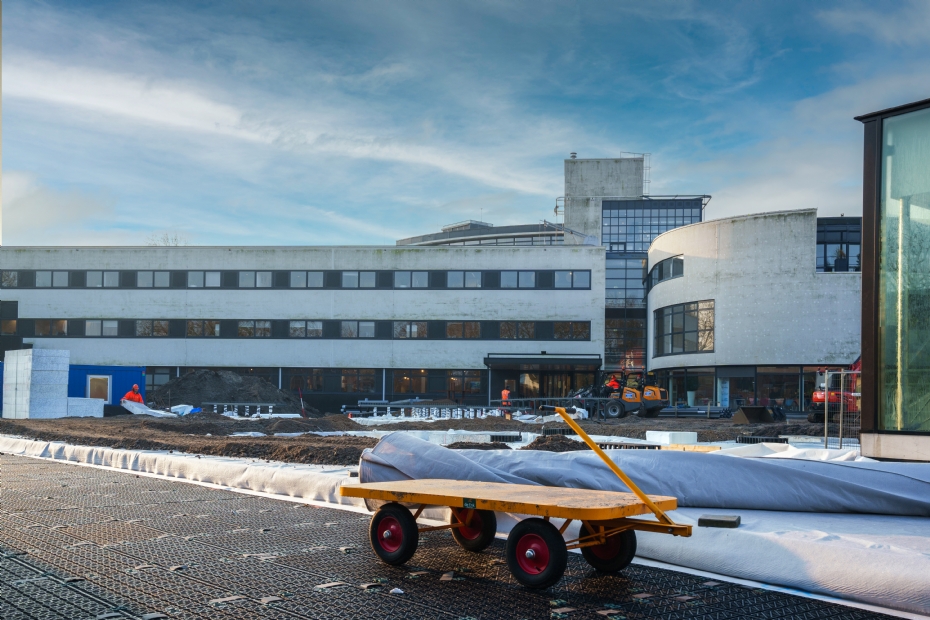 Afgelopen herfst en winter had Nederland te maken met uitzonderlijk veel regenval. In Noord-Holland misschien nog wel meer dan elders en dat leverde lastige omstandigheden op bij de realisatie van het project. 'Het was echt een uitdaging om het water van het dak af te krijgen,' vertelt Rob Scholten, werkvoorbereider bij De Enk Groen & Golf. De wateroverlast bewees echter direct de noodzaak van dit project. 'Een retentiedak biedt de ideale oplossing voor het bergen van grote hoeveelheden water.'