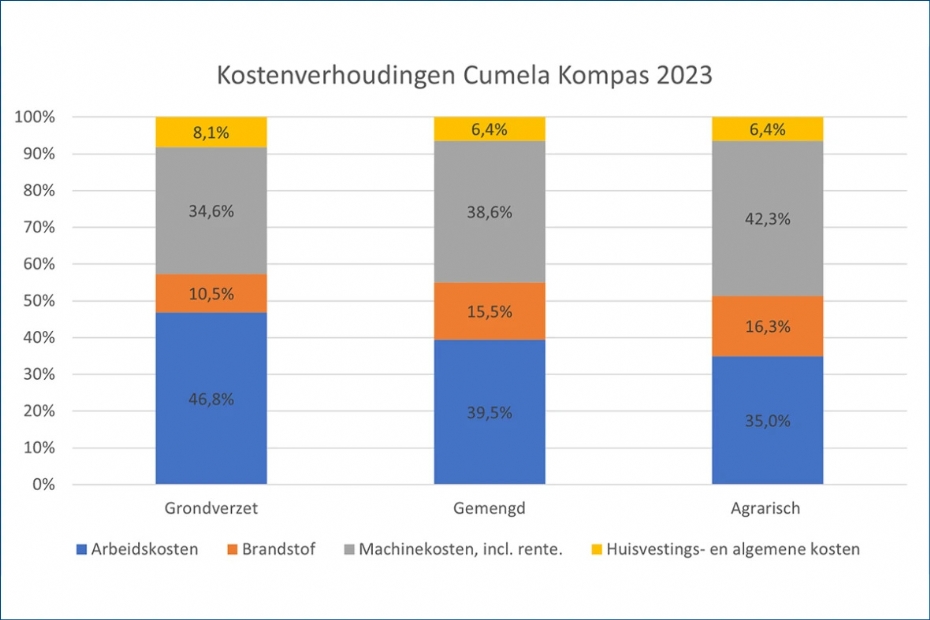 Dit blijkt uit cijfers naar aanleiding van onderzoek van Cumela. Hieruit is te zien dat bij bijvoorbeeld grondverzetbedrijven het meest wordt besteed aan arbeidskosten terwijl bij agrarische loonbedrijven de machinekosten juist de grootste kostenpost zijn. De uitkomsten zijn gebaseerd op 206 bedrijven die hebben deelgenomen aan het onderzoek van Cumela Kompas.