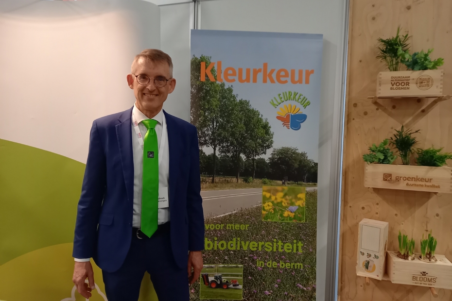 Dick Oosthoek van Groenkeur: 'We staan voor veilig, vakkundig en verantwoord werken. Dat dragen we graag uit op deze vakbeurs. Vandaag en morgen ligt de focus op groene daken en groene gevels, en op ecologisch beheer van bermen en watergangen. Voor laatstgenoemde hebben we een nieuwe richtlijn ontwikkeld.'