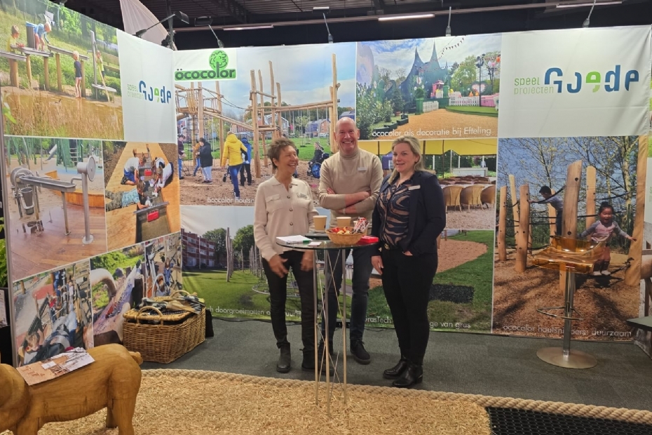 Kirsten Goede, Rob Lamberts en Nicole Beerens bemensen de stand van Goede Speelprojecten. Ze tonen op de beurs hun öcocolor valdempende houtsnippers voor speel- en sportterreinen. Het is hout van voormalig pallets, lekker circulair dus! Ook tof: het is berijdbaar voor rolstoelgebruikers, kinderwagens e.d.