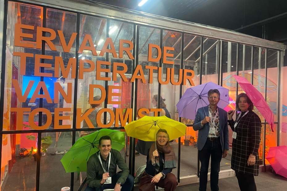 Op het klimaateiland, nieuw op de beurs, vind je de GGD, Groene Huisvesters, Klimaatverbond Nederland, SAMEN Klimaatbestendig, TAUW en TwynstraGudde. Opvallend is de kas waar de temperatuur oploopt tot 35 graden. Hier kun je in gesprek over de steeds warmer wordende zomers: hoe ga je hier mee om als gemeente of ondernemer? De reacties in de kas variëren van "oh lekker, voelt als vakantie" tot uiteindelijk de kas uitvluchten omdat het toch niet zo prettig is.