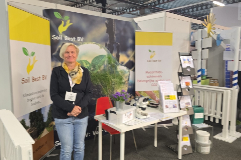 Jacqueline Baar van Soil Best introduceert BioMyPro-mix, een ready-to-use mix voor o.a. bomen op basis van mycorrhiza en organische bemesting. Mycorrhizaschimmels nemen per jaar 13 miljard(!) ton co2 op, zo weet ze ons te vertellen.