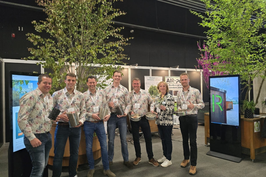 Circulariteit is ook samenwerken. Rutger Hornikx van Air-Pot, Luuk Leeuw van Zoontjens, Willem Stoutjesdijk en David van Twist van Pontilair, Arjan en Monique Zoontjens, samen met Jeffrey van Akkeren van Flexibilitree. Air-pot is gerecycled materiaal, Pontilair is gerecycled slib tot substraat, Flexibitree is co2 vrij staal en circulair plastic voor straat materiaal. Kortom, samenwerken voor circulariteit.