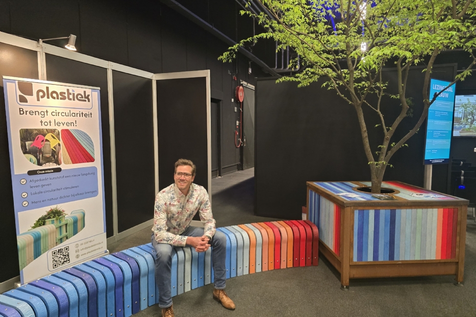Jilles Verspoor van Plastiek. Hij is nu een jaar als start-up, verbonden met Zoontjens Boomprojecten. Zijn doel is om circulariteit tot leven te brengen. Hoe? Nou, door gerecyclede banken te maken. Van voormalige financieel bankman tot huidig gerecyclede bankman!
