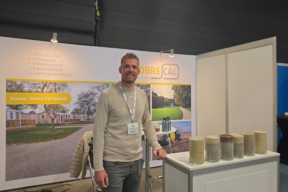 Bertus Benjamins van Nobre Cál Halfverharding introduceert Nobre Cál gravel op de beurs. Een grovere structuur met een hogere belasting en betere waterdoorlaadbaarheid. Én mooi van kleur. Beige is het nieuwe grijs.