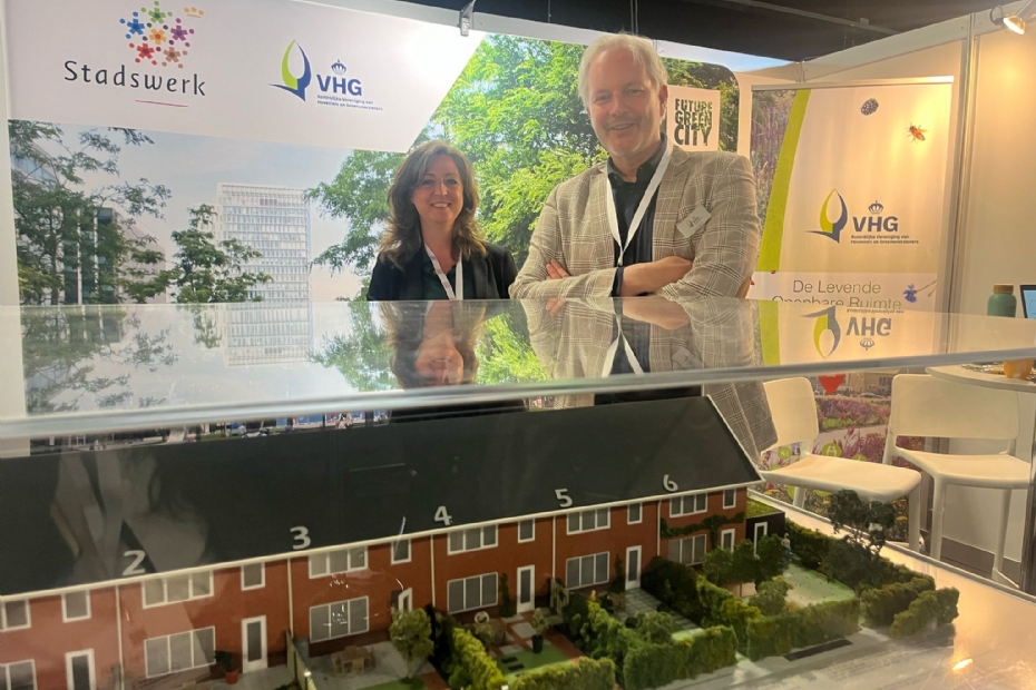 Bij Stadswerk en Koninklijke VHG trekt de visuele maquette over welk effect een groen blauwe tuin heeft weer de aandacht. Louise Kok en Marc Derksen lichten bezoekers voor over de voordelen van groen.