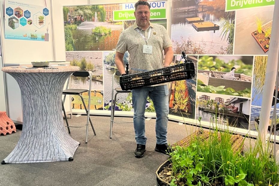 Willem Kan van Drijvend Groen licht bezoekers in de voordelen van drijvende groen eilanden. Hier kan je planten op kwijt, maar bijvoorbeeld ook waterzuiverende mosselkorven onderhangen. Het gaat om een mosselfiltratiesysteem van h2o Blue en het is nét uitgebracht. Hierin realiseer je eigenlijk de ideale vestigingsplaats voor de hechting van mosselen. Mosselen zijn ideale partners in het zuiveren van water. Bijvoorbeeld pfas, microplastics en zware metalen kunnen mosselen filteren, als je dan vervolgens de mosselontlasting opvangt krijg je betere waterkwaliteit. Zo beloofd Kan.
