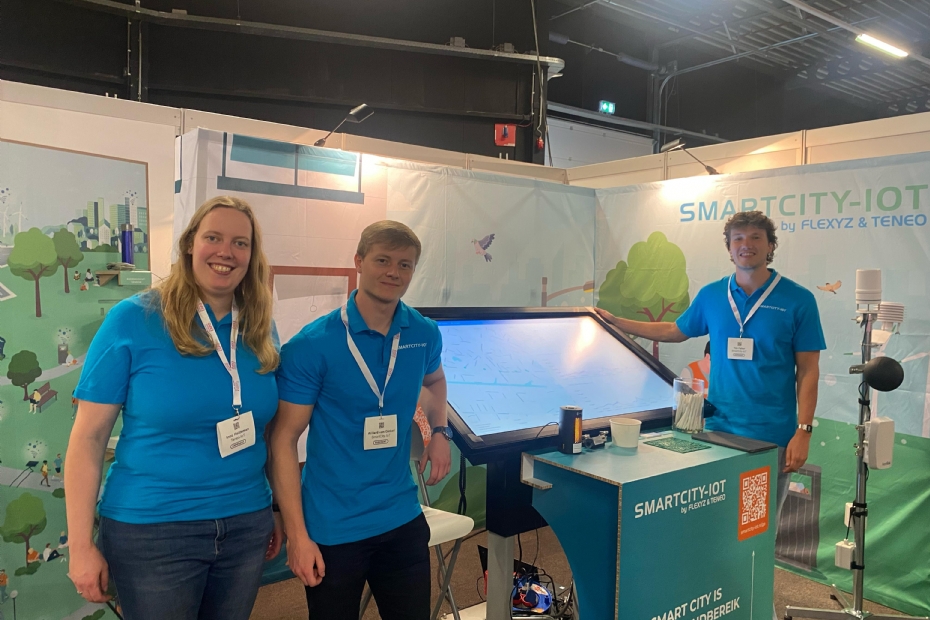 Het jonge team van Smart City-IoT toont hun brede diversiteit aan sensoren. Dit gaat van bodemvochtmonitoring en afvalbeheer tot mobiliteitsonderzoek. Op het grote scherm in hun stand zijn actuele beelden te zien van verkeersstromen in Hengelo.