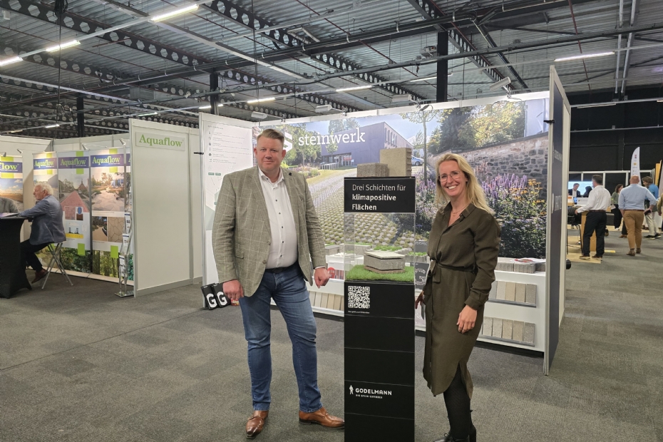 Een next-level klimaatsteen bij Steinwerk. Slaat eerst water op, en laat dan langzaam hetzelfde water gezuiverd weer los. Het werkt daarmee verkoelend én is geluidsreducerend. Op de stand Elma Bubers van Steinwerk en Maikel te Nijenhuis van Godelman.