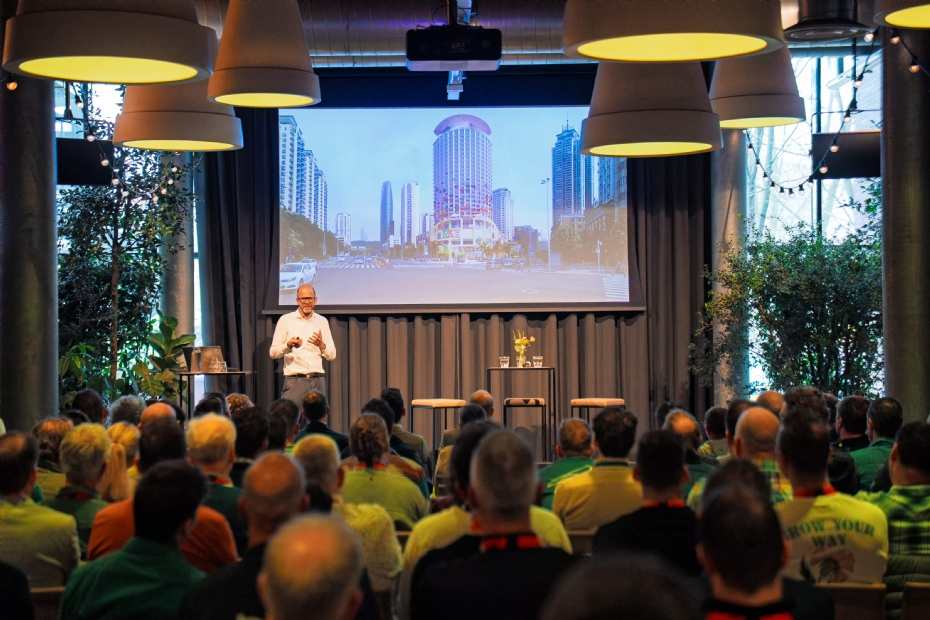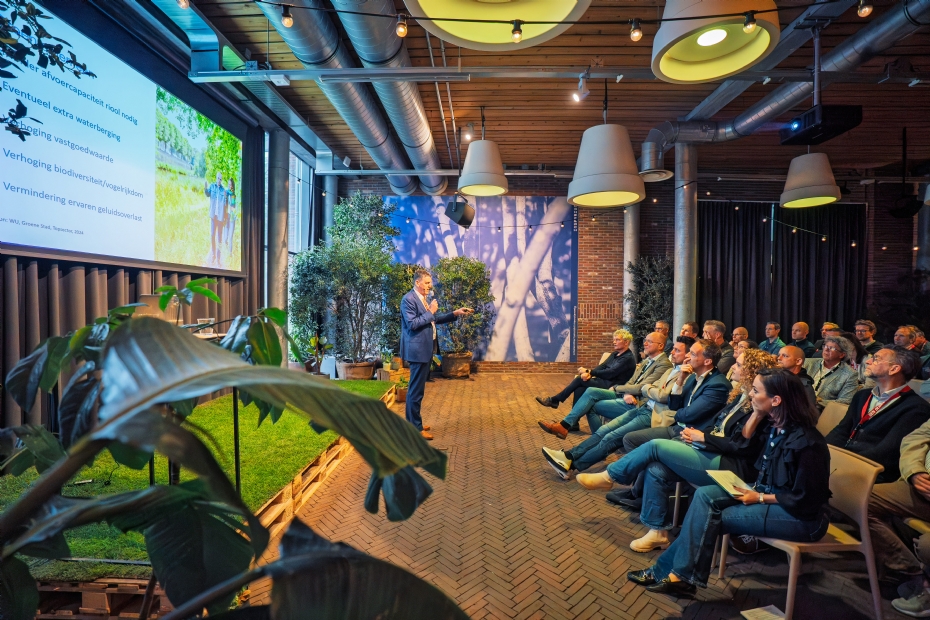 De derde spreker was Gideon Maasland, architect en directeur bij MVRDV. Hij belichtte de uitdagingen van vergroening in dichtbebouwde binnensteden. Maasland daagde het publiek uit om niet terug te kijken naar traditionele oplossingen, maar vooruit te denken: hoe zouden toekomstige generaties de stad inrichten? Je moet relevant blijven. Zijn betoog liet zien dat vergroening ook bij complexe bouwopgaven mogelijk is, mits ontwerpers en beleidsmakers bereid zijn anders te denken. 'Out of the box denken met menselijke maat.'